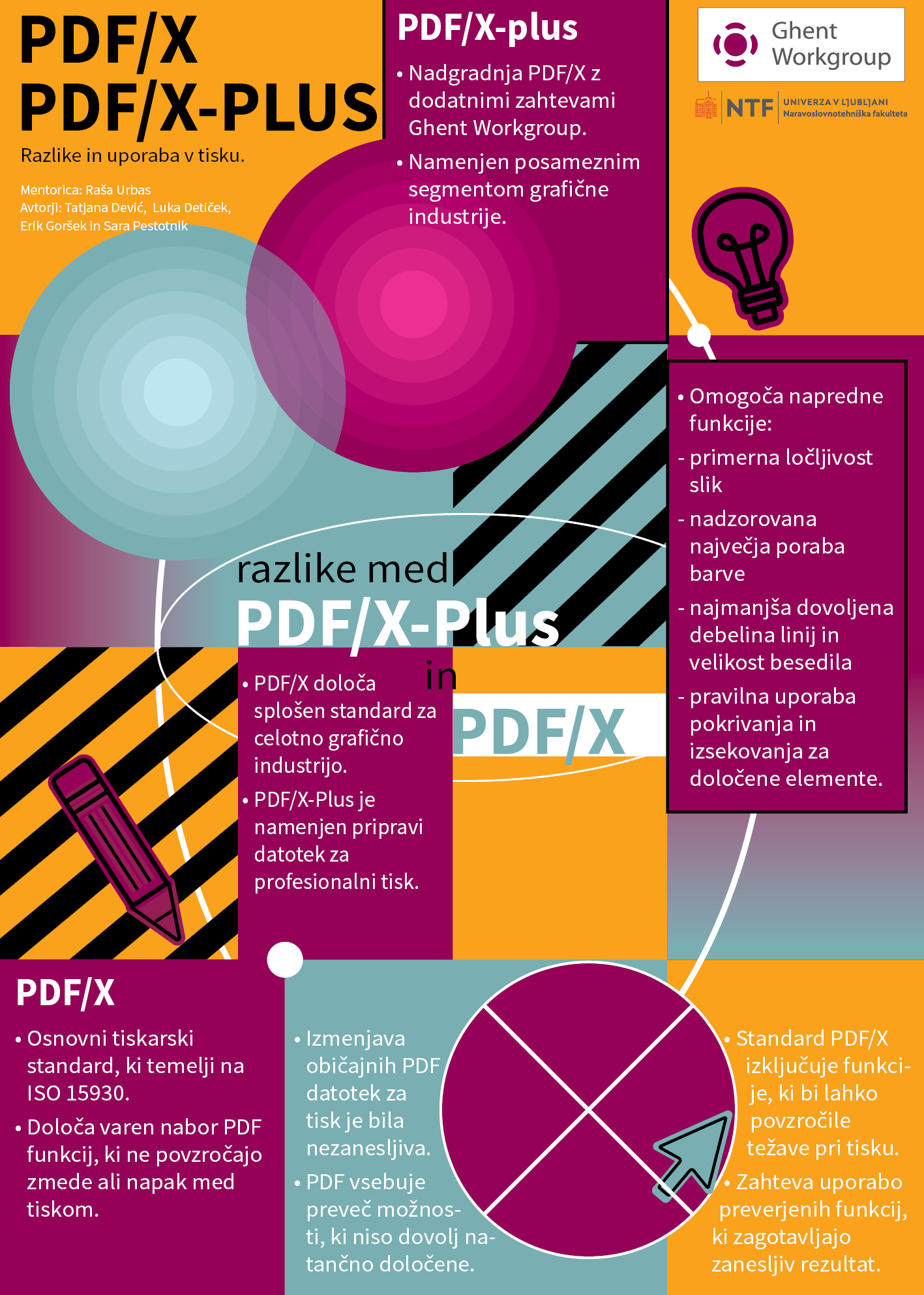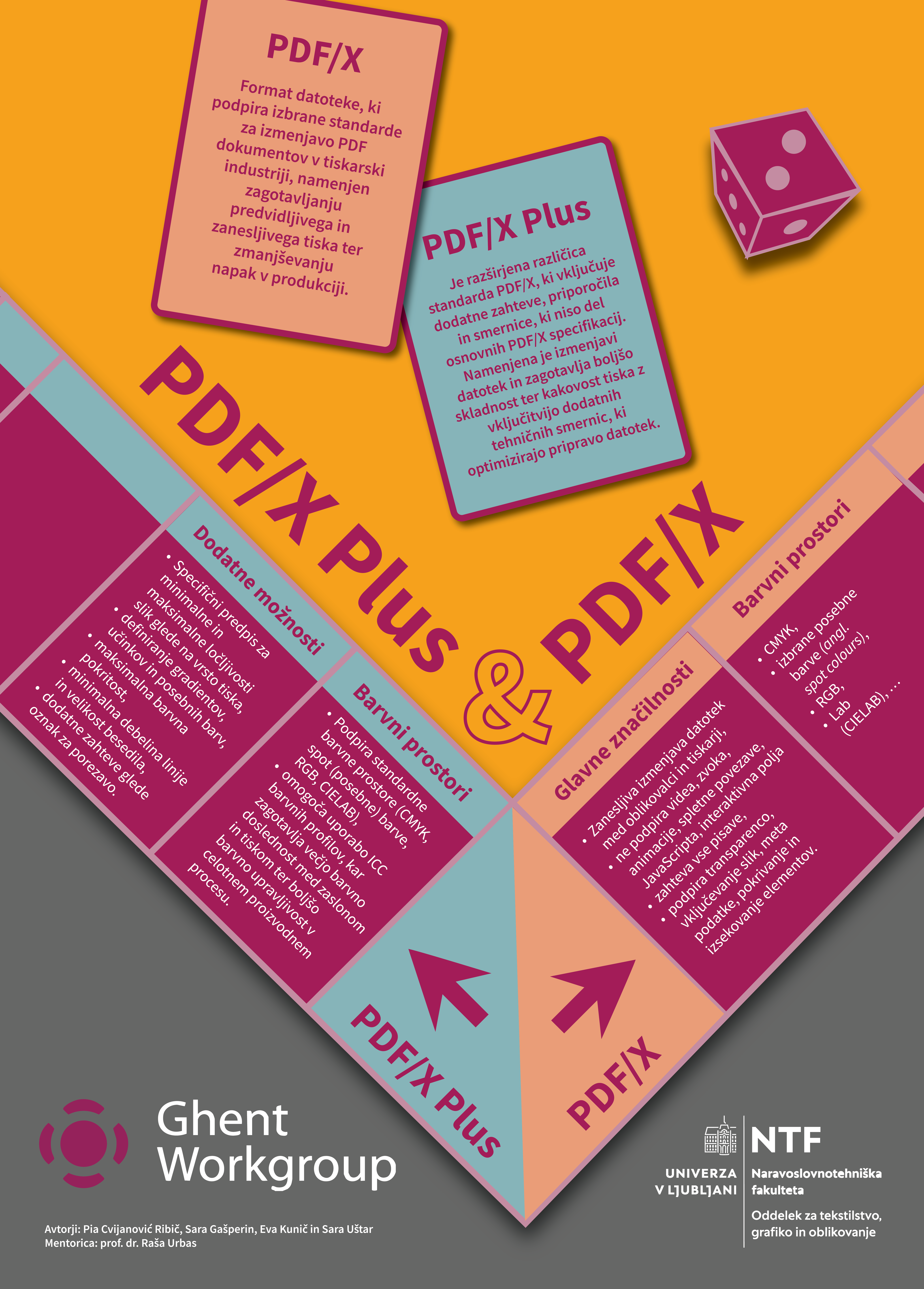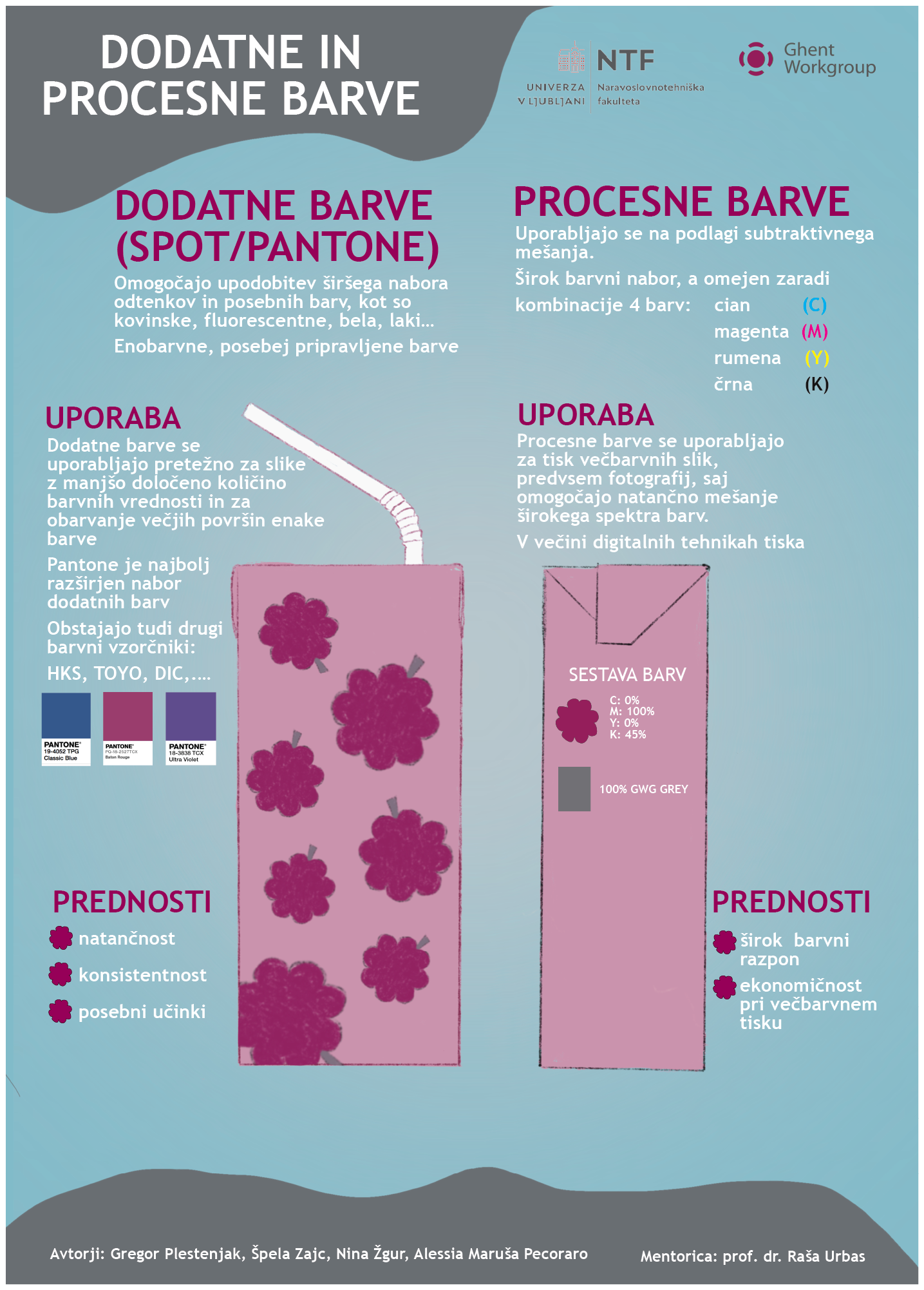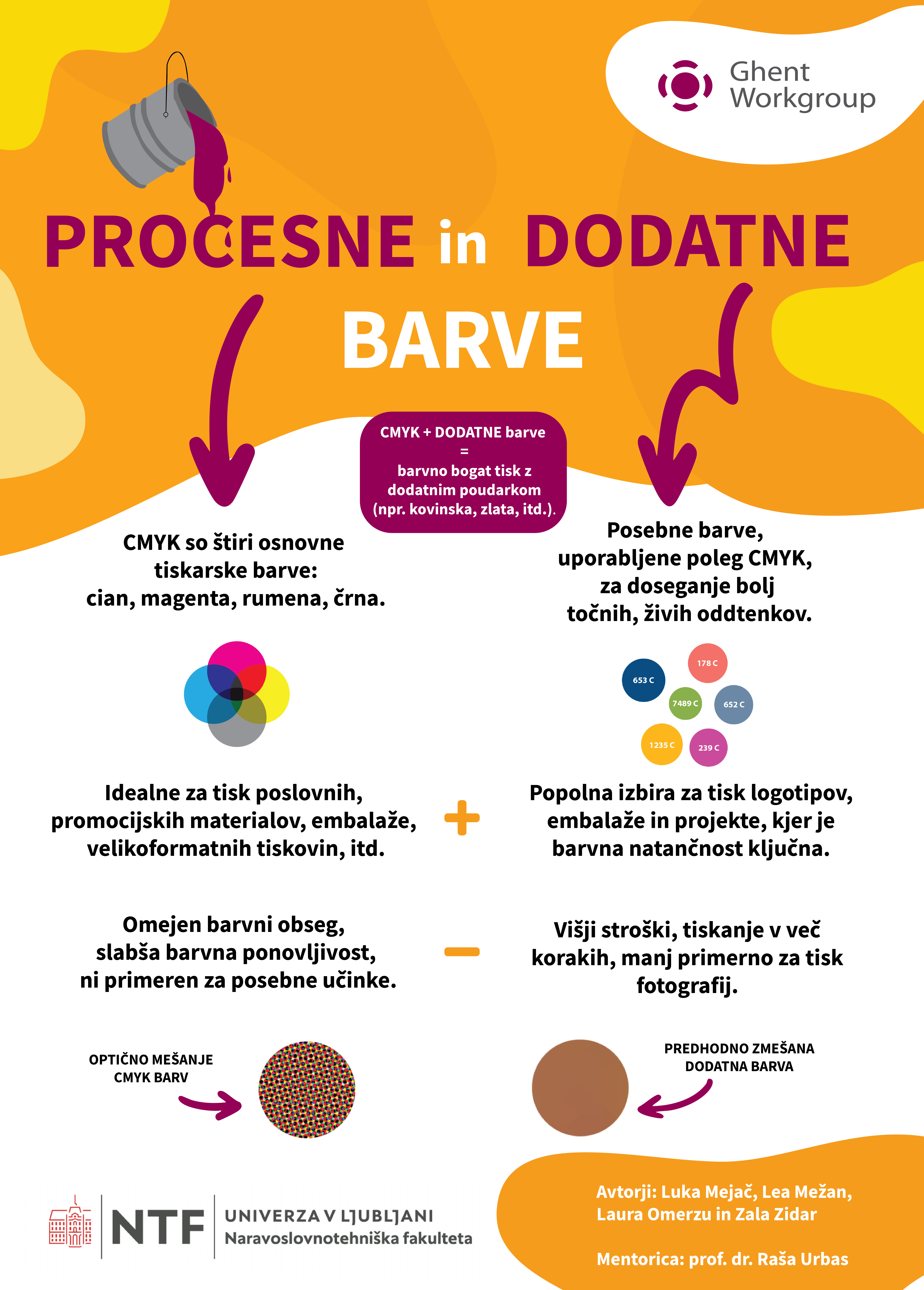 Projekt »GWG infografike« je nastal v okviru mednarodnega sodelovanja z grafičnim združenjem Ghent Workgroup (GWG) − vodilnim mednarodnim združenjem strokovnjakov s področja grafične tehnologije, oblikovanja, tiska, založništva in embalaže. Glavni cilj združenja je razvijati in širiti ter uveljavljati najboljše prakse ter standarde na področju grafične priprave in delovnih procesov. Priporočila in specifikacije GWG omogočajo strokovnjakom po svetu zanesljivo ustvarjanje, obdelavo in izmenjavo grafičnih datotek za najrazličnejše aplikacije.