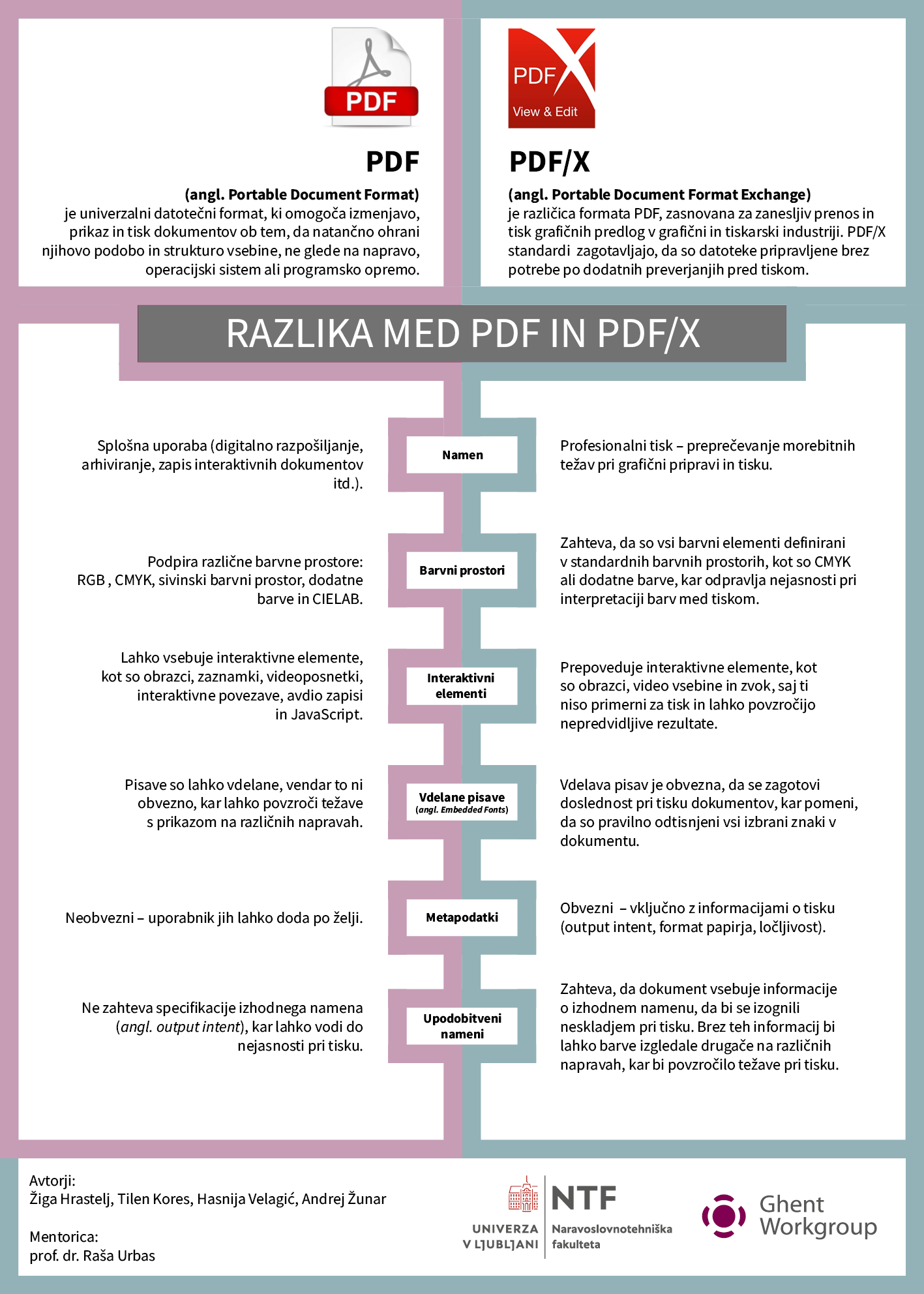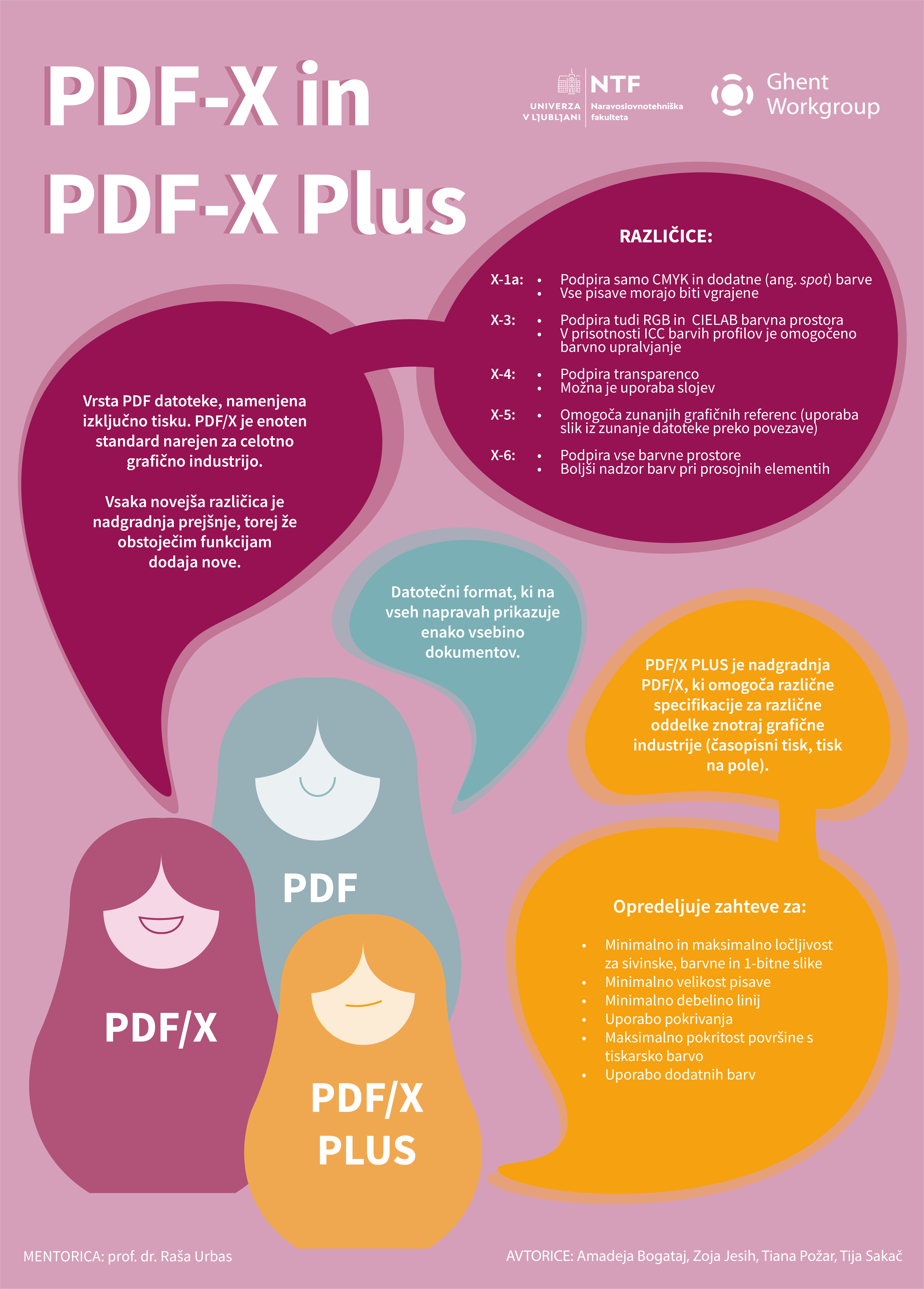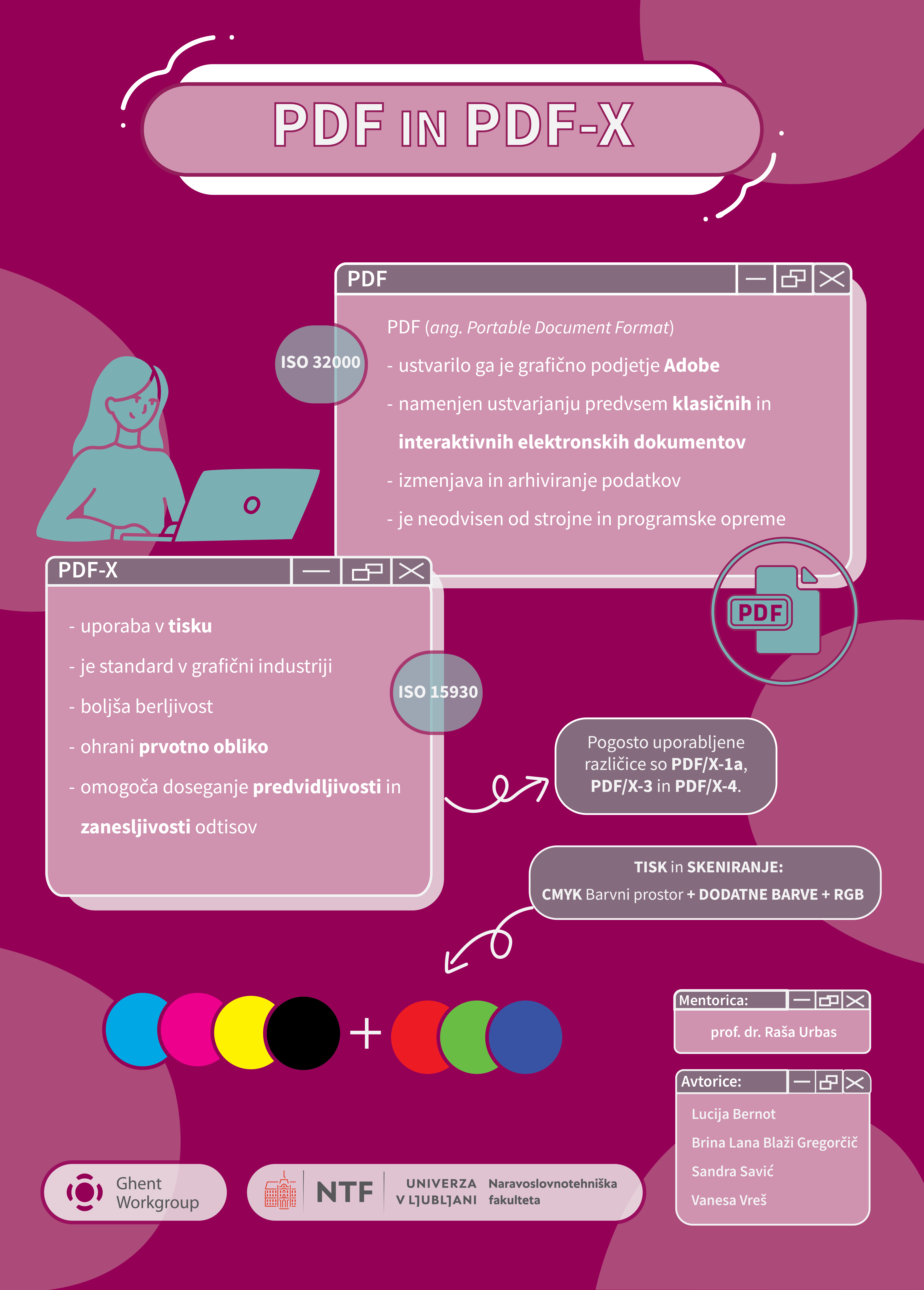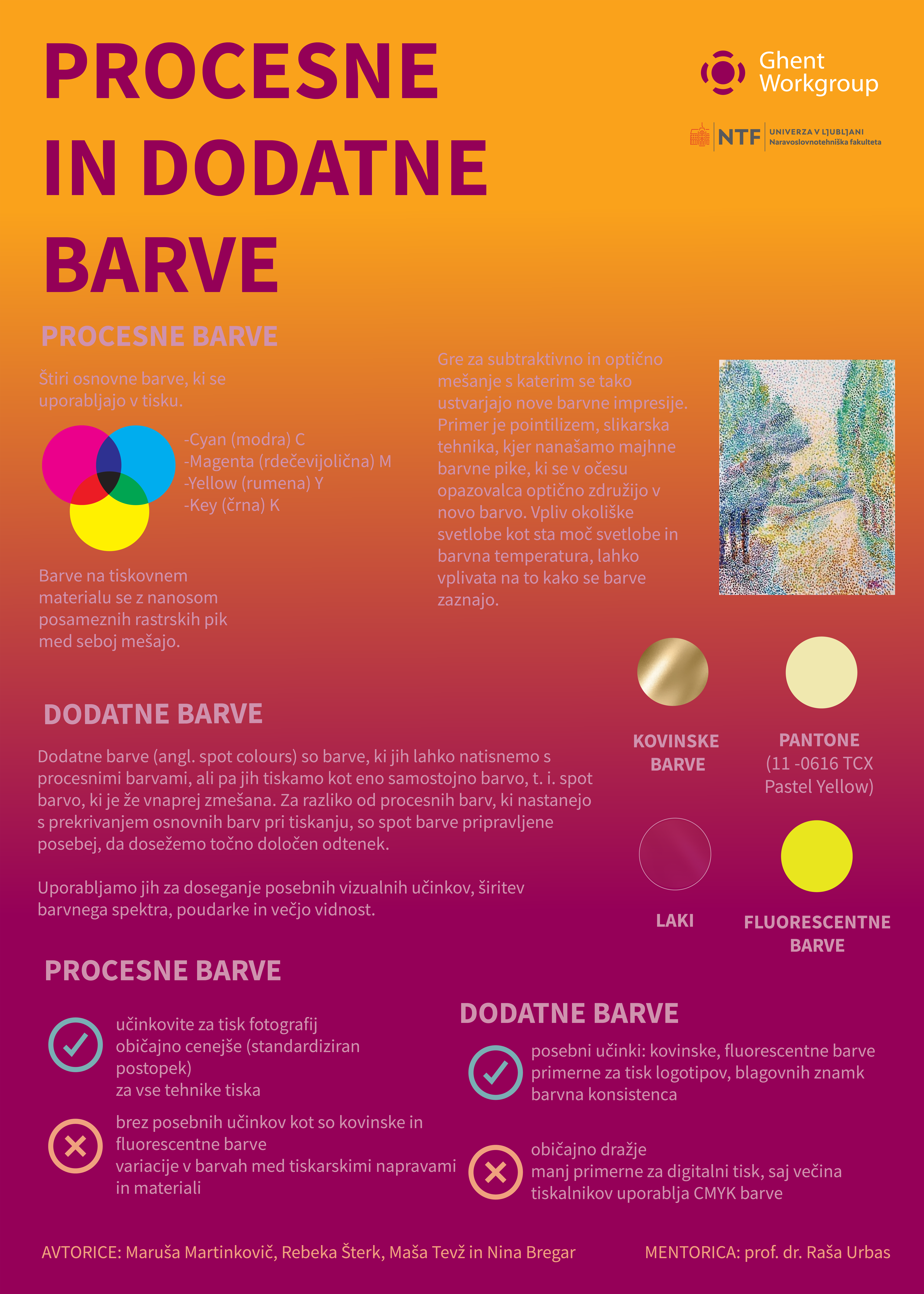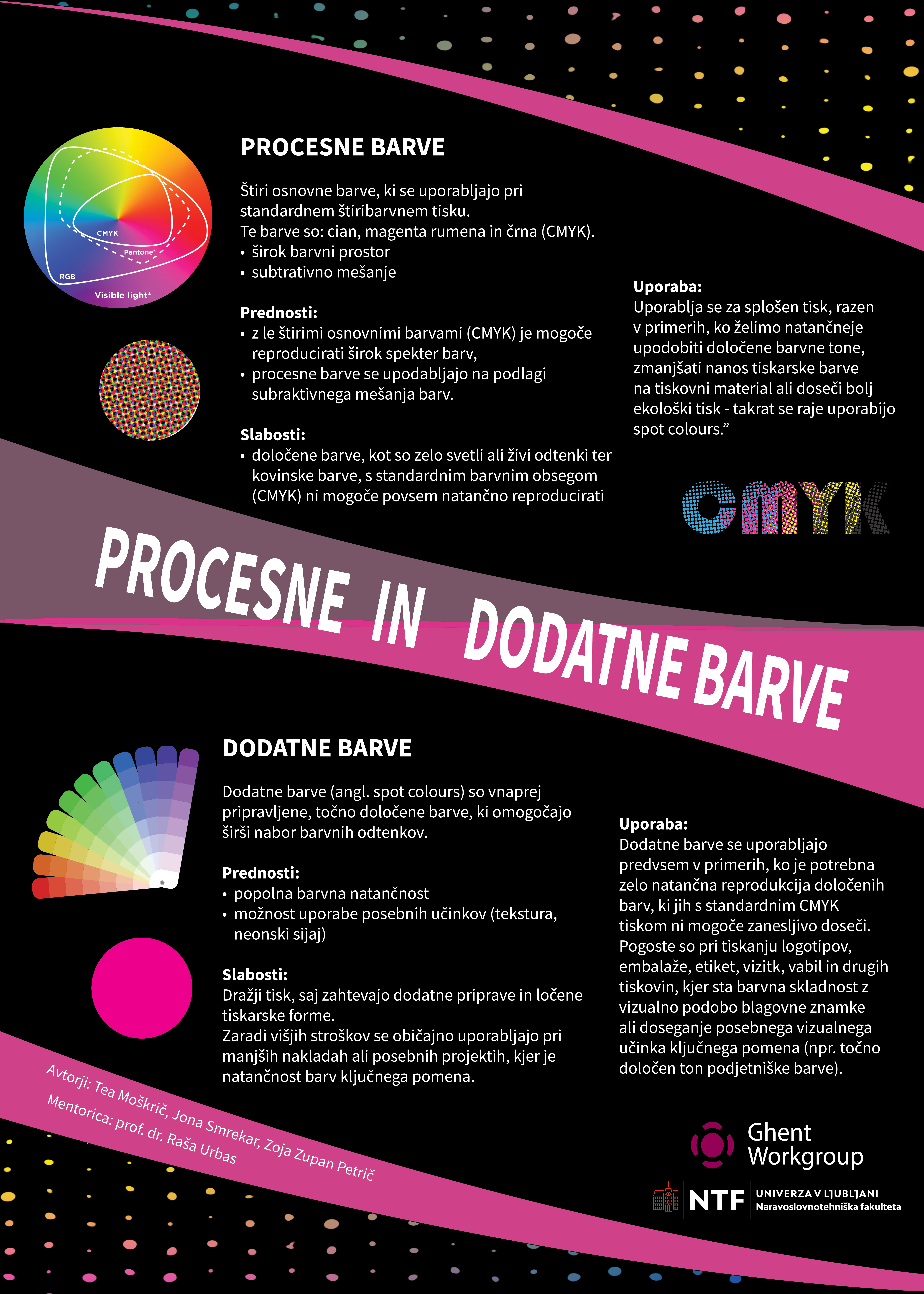 Projekt »GWG infografike« je nastal v okviru mednarodnega sodelovanja z grafičnim združenjem Ghent Workgroup (GWG) − vodilnim mednarodnim združenjem strokovnjakov s področja grafične tehnologije, oblikovanja, tiska, založništva in embalaže. Glavni cilj združenja je razvijati in širiti ter uveljavljati najboljše prakse ter standarde na področju grafične priprave in delovnih procesov. Priporočila in specifikacije GWG omogočajo strokovnjakom po svetu zanesljivo ustvarjanje, obdelavo in izmenjavo grafičnih datotek za najrazličnejše aplikacije.