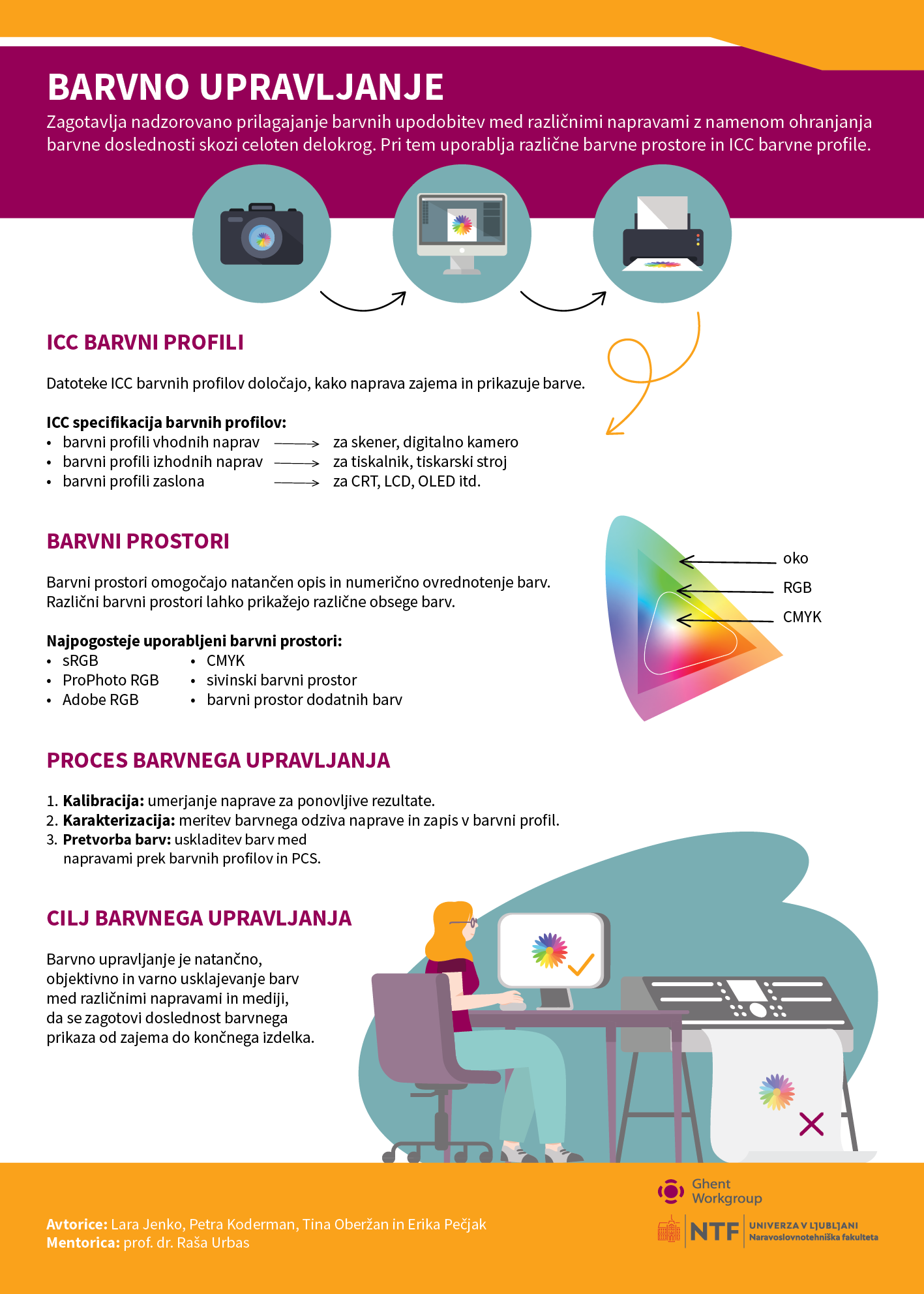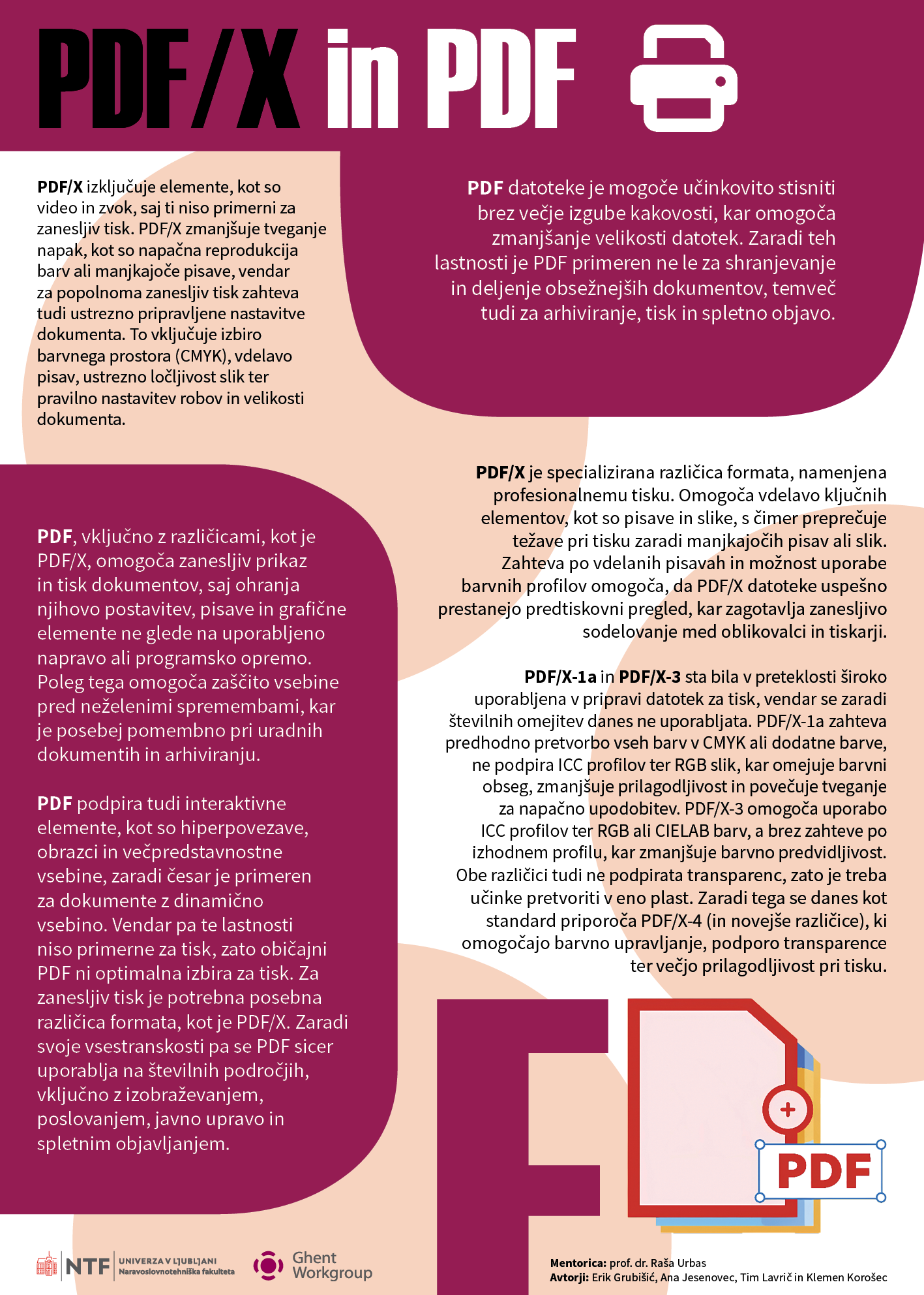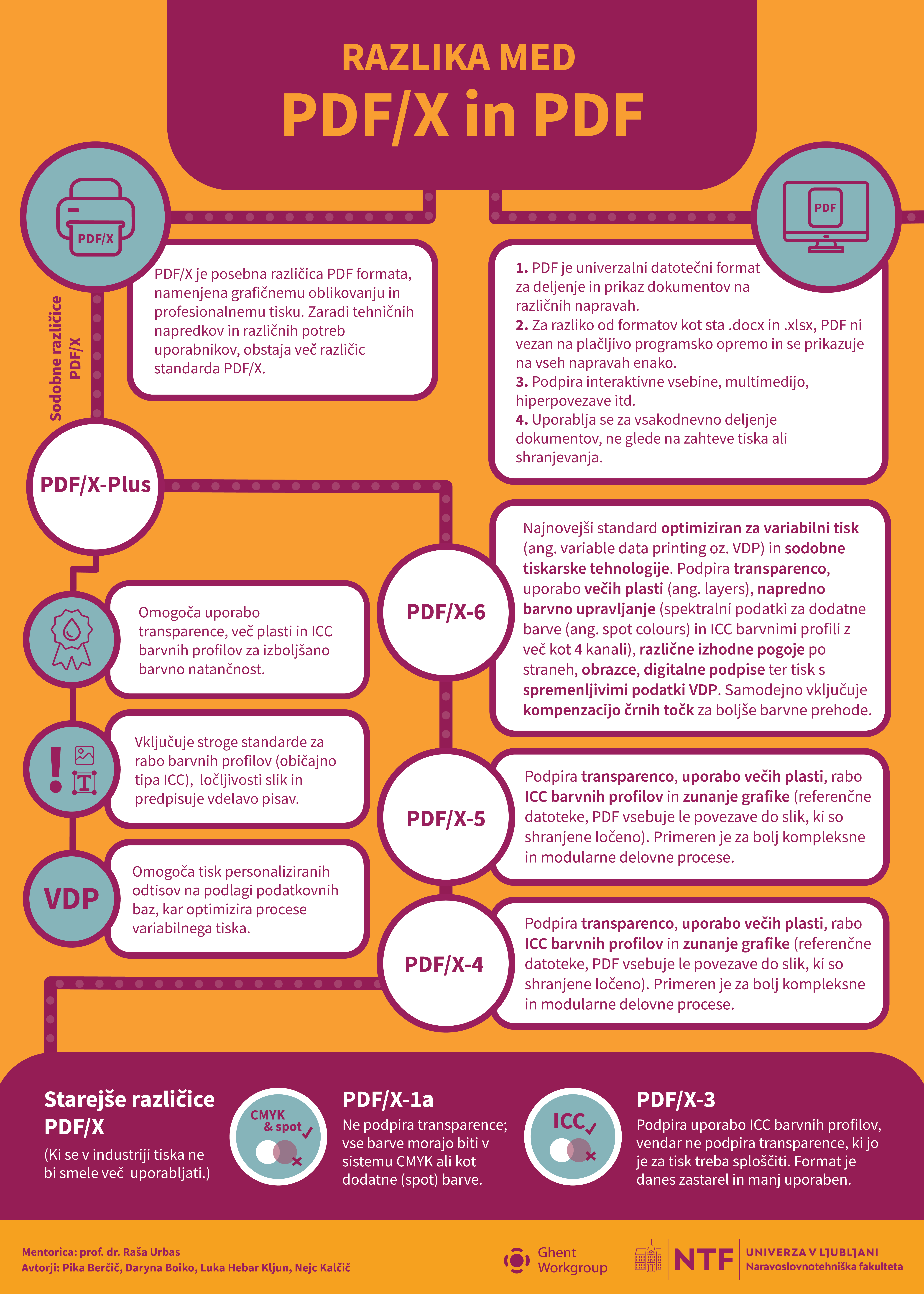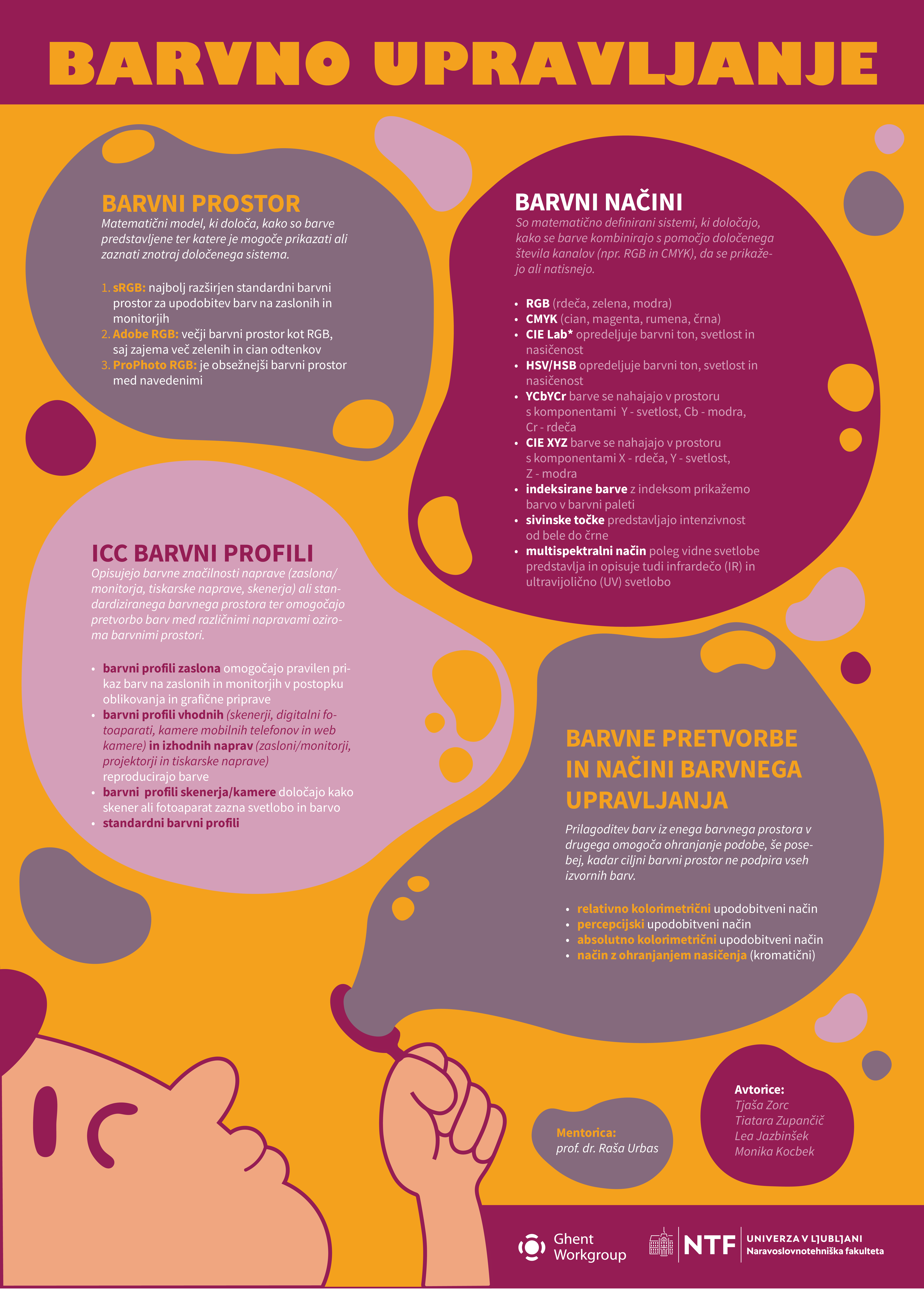 Projekt »GWG infografike« je nastal v okviru mednarodnega sodelovanja z grafičnim združenjem Ghent Workgroup (GWG) − vodilnim mednarodnim združenjem strokovnjakov s področja grafične tehnologije, oblikovanja, tiska, založništva in embalaže. Glavni cilj združenja je razvijati in širiti ter uveljavljati najboljše prakse ter standarde na področju grafične priprave in delovnih procesov. Priporočila in specifikacije GWG omogočajo strokovnjakom po svetu zanesljivo ustvarjanje, obdelavo in izmenjavo grafičnih datotek za najrazličnejše aplikacije.