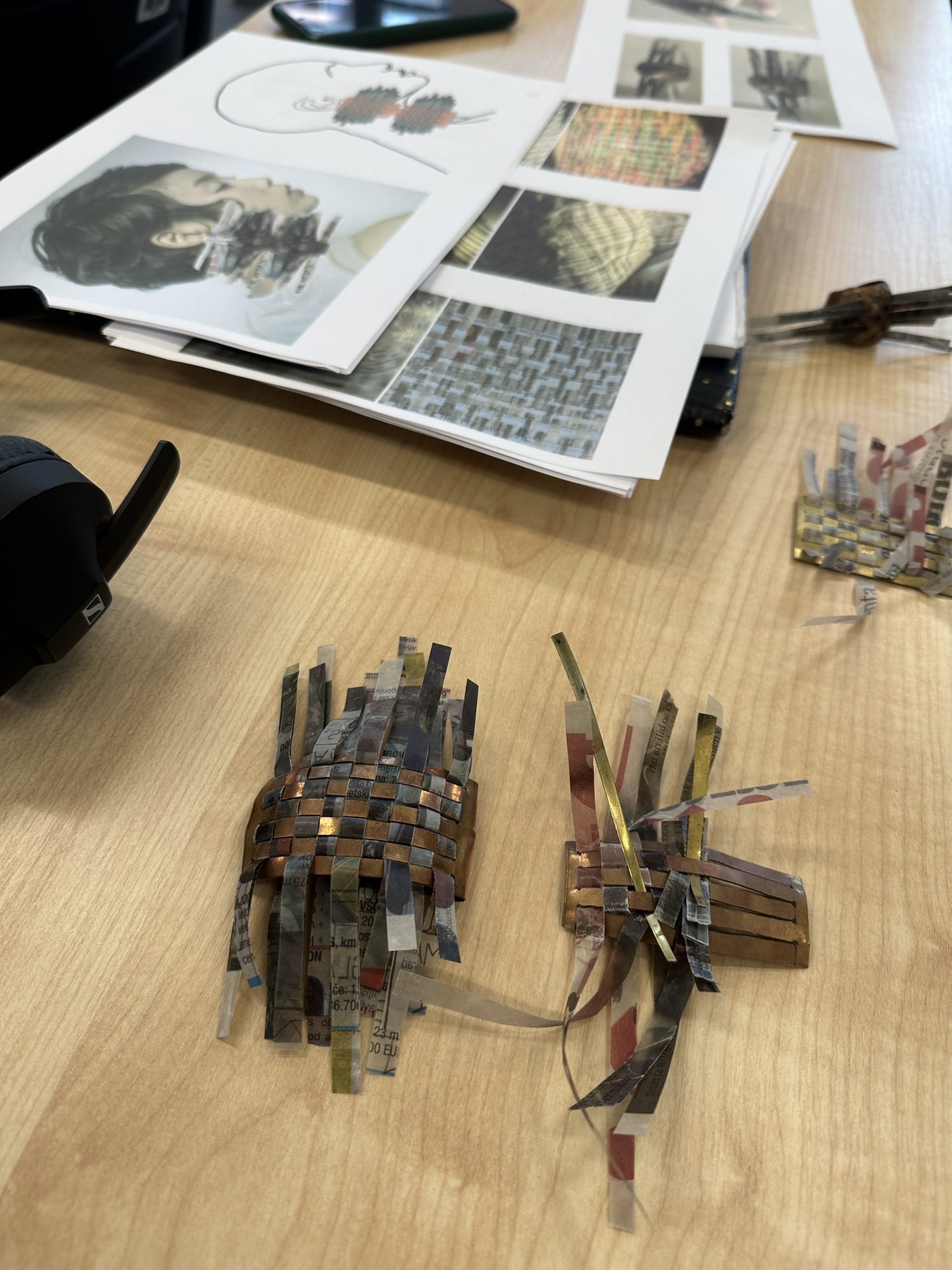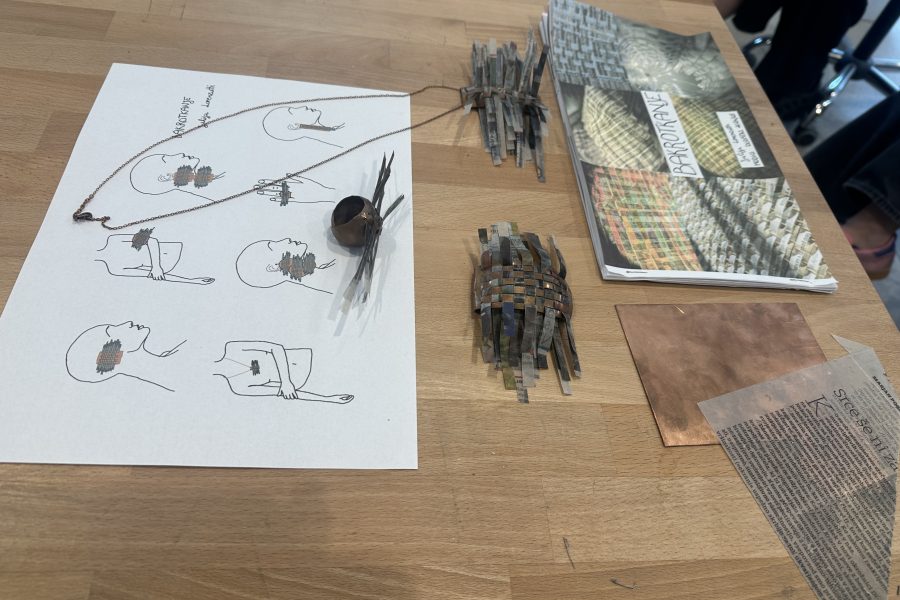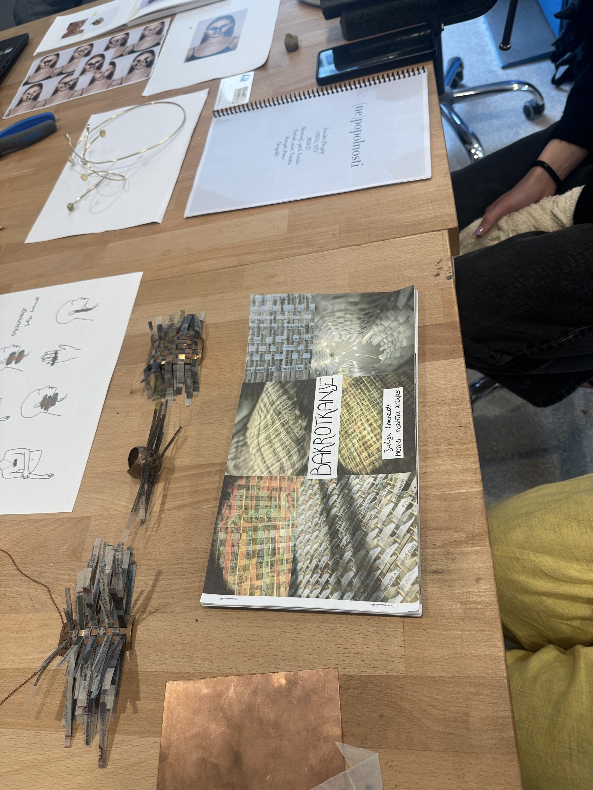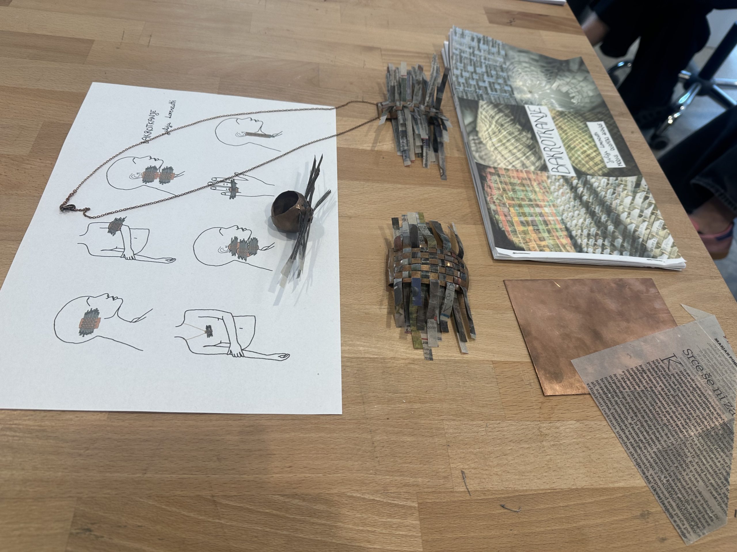 Kolekcija Bakrotkanje združuje tekstilno tkanje s kovino; v kovino je vtkan presenetljiv material, z voskom obdelan papir, ki estetsko, kompozicijsko in funkcionalno nadgrajuje kovinsko formo.