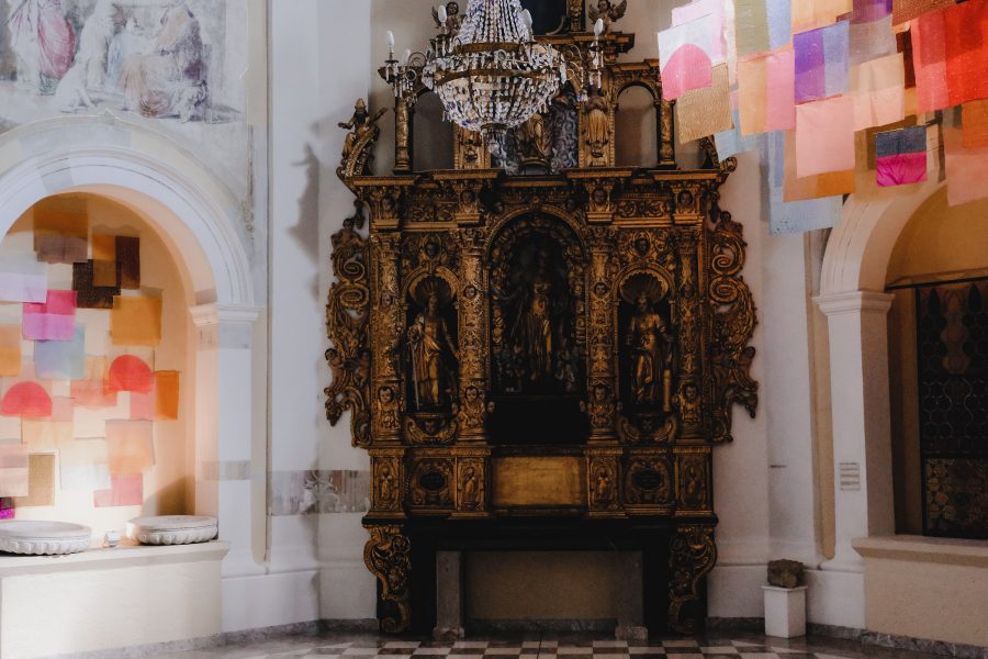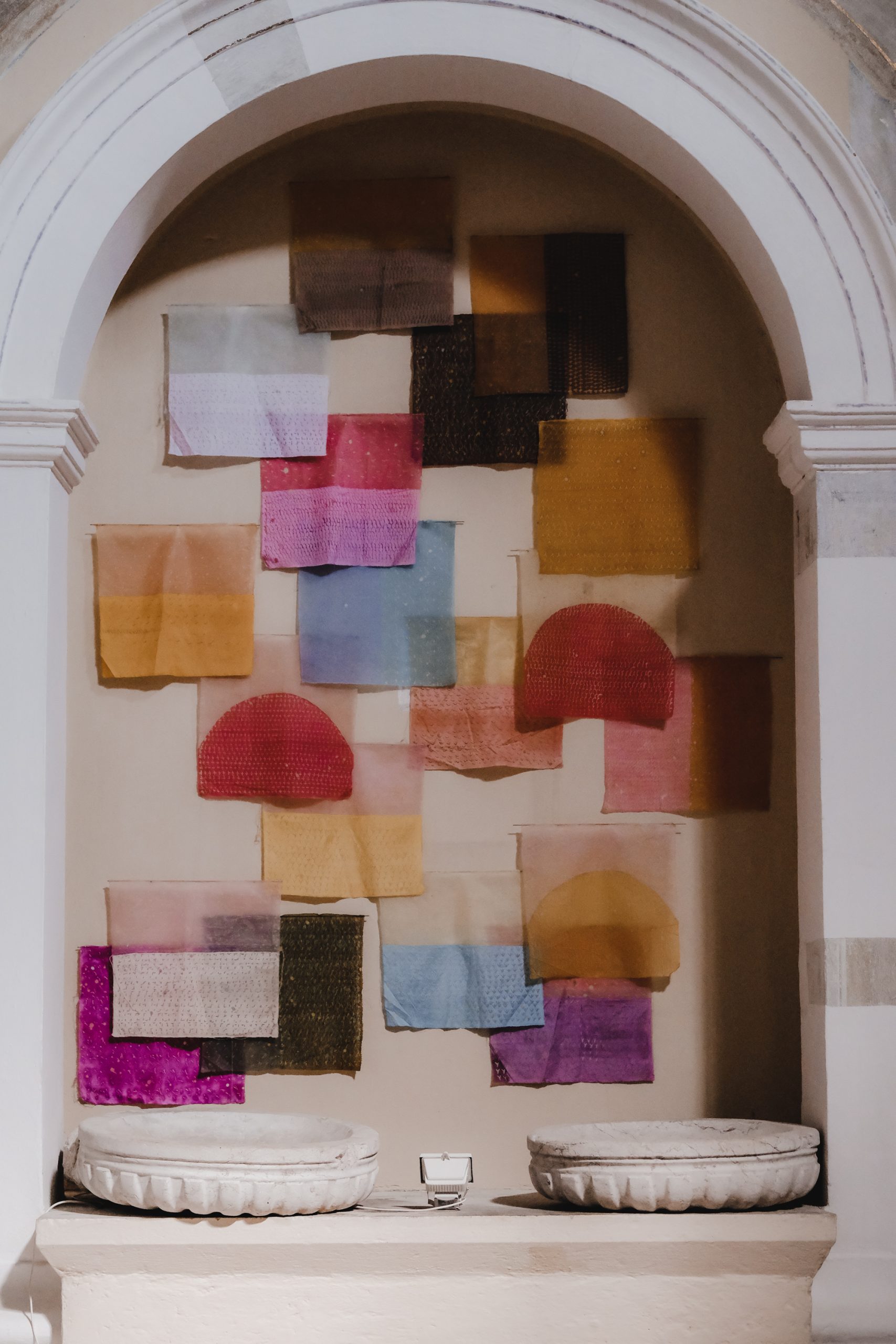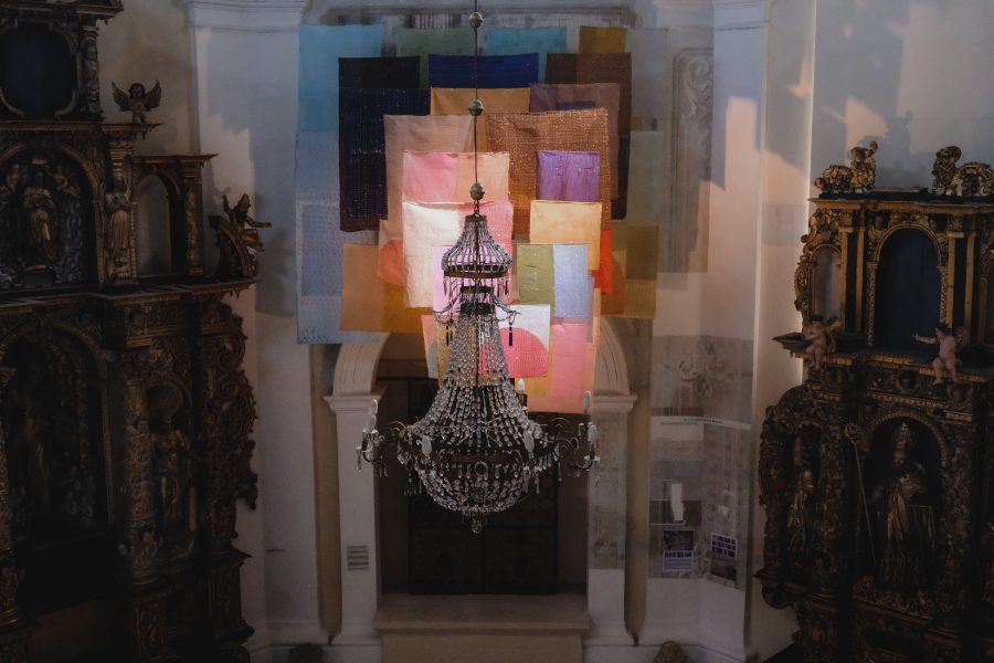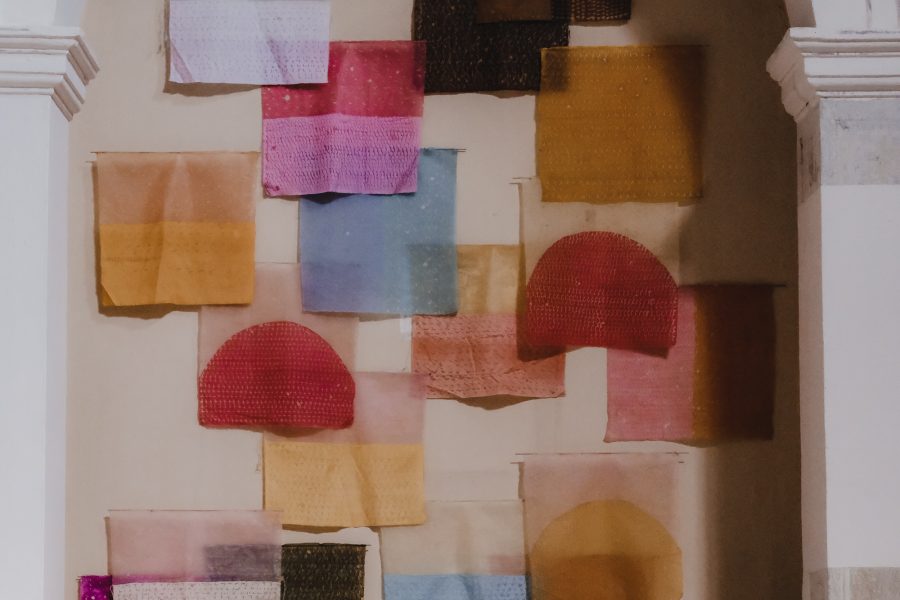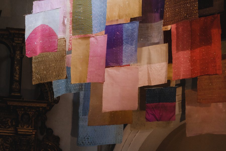 Segreva, naliva vosek v tjanting – previdno, da se ne opeče. Vzame starodavno tekstilno orodje v roke, začuti njegov oprijem, ravno pravšnjo težo – in zapis steče po svili kar sam od sebe. Roka, podaljšek njenih misli, mehko lebdi nad svilenim listom. Počasi kroži v zapestju. Vosek se ne sme razliti čez rob tjantinga! Nežno zacvrči, ko vroča maščoba kapne na žlahten svilen material in se vanj vpije. S tanko, posteklenjeno črto počasi oblikuje pisavo. Piše gosto, od leve proti desni, enakomerno, vrstico za vrstico. Teksturira enake ploskve – liste v svoji tekstilni knjigi. Meditira v tišini. Še preden se roka utrudi, se vosek ohladi. Spet ga stopi in nadaljuje, kjer je ostala, vse dokler ne poriše cele ploskve. Dvigne jo povsem blizu oči – kot bi gledala skozi umetelno rešeto svoje podzavesti. Prostor je že ves prežet s sladkobnim vonjem po talečem se vosku, a vseeno predse potegne novo, nepopisano tekstilno pismo. Ve, kako ga bo zapisala. Vedno znova na enak način, a znotraj te obredne enakosti vsakič drugače. Dan je dnevu podoben, a nikoli nista dva enaka. Monotonija je vse prej kot dolgočasna.